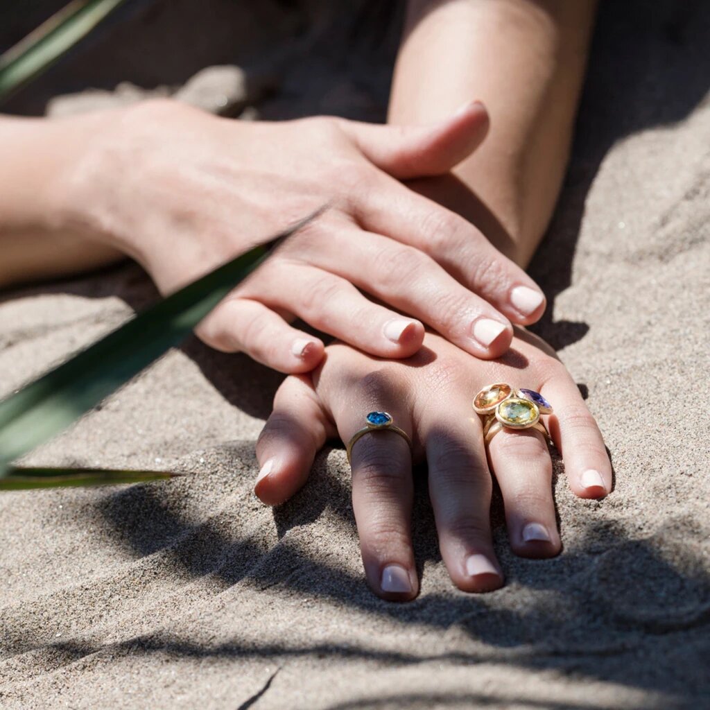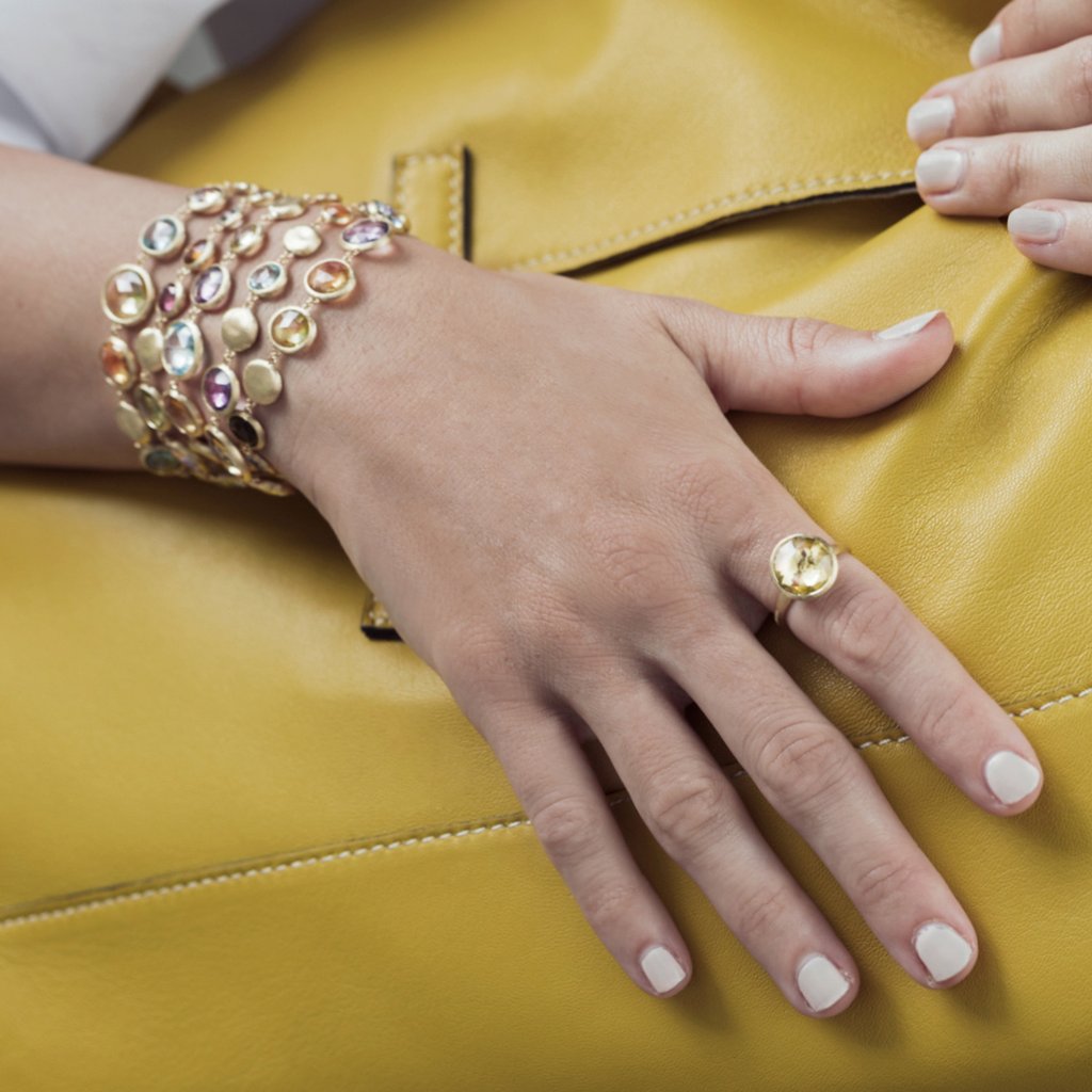 Anello impilabile medio con cuscino taglio rosa citrino limone. Ispirato al tramonto indiano tropicale e all'eredità di Jaipur, questo anello di gemme multicolore a colori Jaipur è inciso a mano da artigiani italiani.