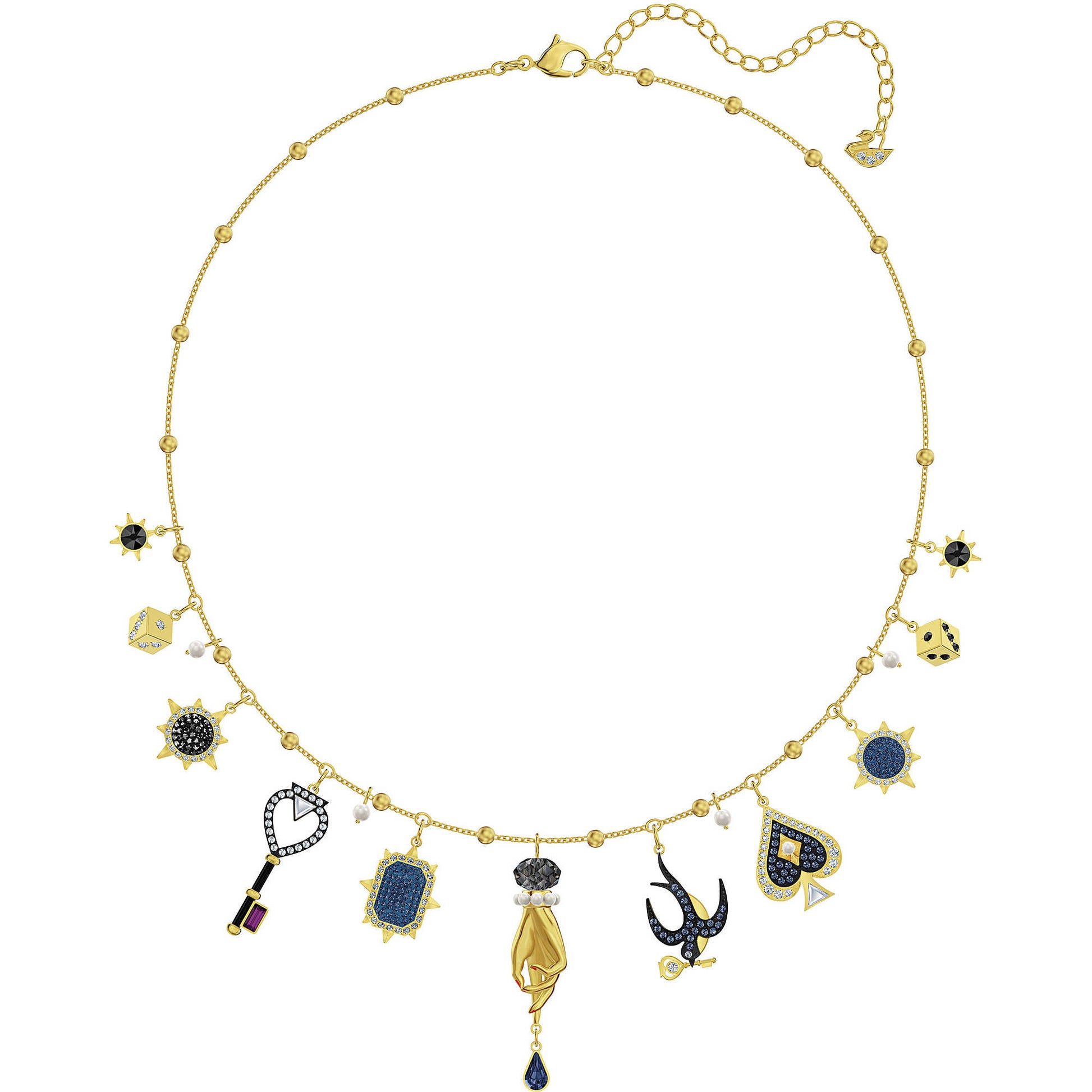 The Tarot Magic jewelry family is inspired by the mystical world of tarot symbols. This must-have charm necklace is enriched with a variety of crystal-encrusted symbols, including a delicate pavé swallow, a symbol of positivity and rebirth, a lucky key motif, and a spade. Elegantly combining blue crystals and gold-tone plated metal, it will add a touch of style to any outfit and never go unnoticed. Pair it with simpler designs for an on-trend look.