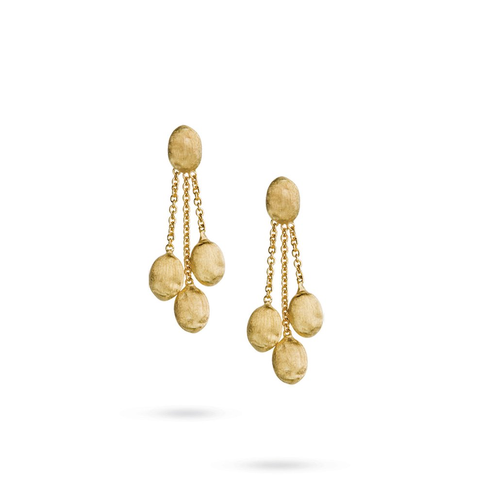 Orecchini a tre fili in oro giallo 18 carati. Ispirati agli antichi ciottoli di Siviglia, questi orecchini in oro Siviglia sono incisi a mano da artigiani italiani.