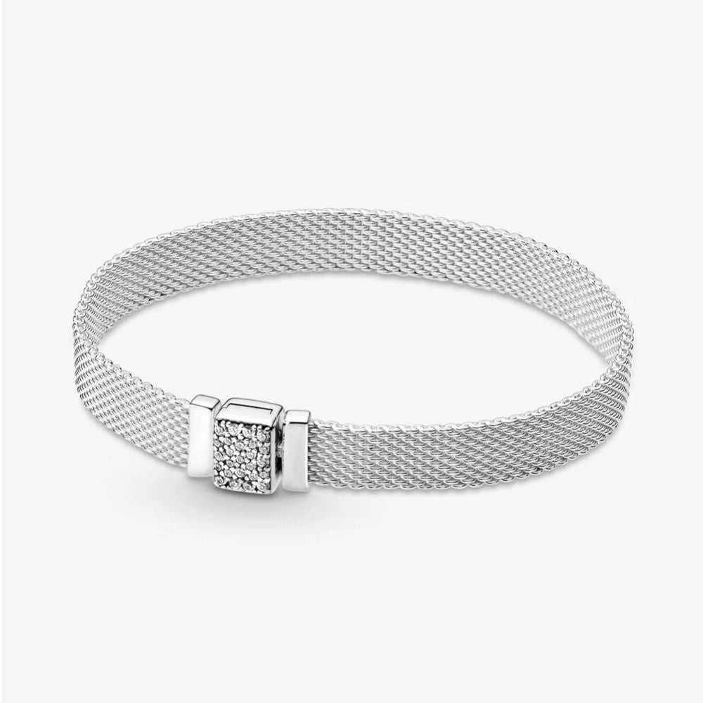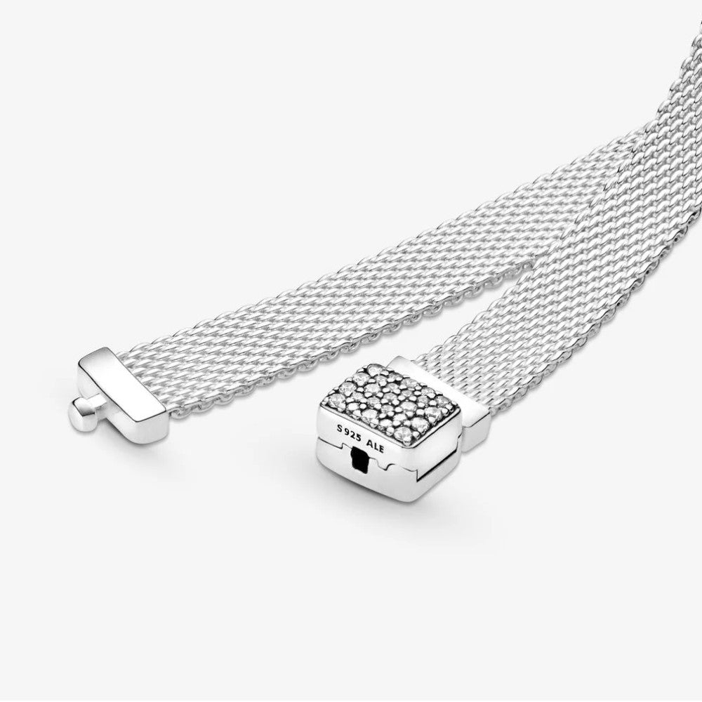 Aggiungi splendore delicato a ogni outfit con questo bracciale Pandora Reflexions con chiusura scintillante. Rifinito a mano e realizzato in Argento Sterling 925, il bracciale con maglia mesh presenta una speciale chiusura rettangolare, una novità assoluta per i bracciali Pandora Reflexions. La chiusura, decorata da pietre di diverse dimensioni e dal logo Pandora sul retro, ha anche una finitura brunita, quindi il suo aspetto cambierà con il tempo, creando uno splendido contrasto con il resto del gioiello. Abbinalo a orecchini a lobo in Argento Sterling 925 per un look sofisticato e sfavillante.