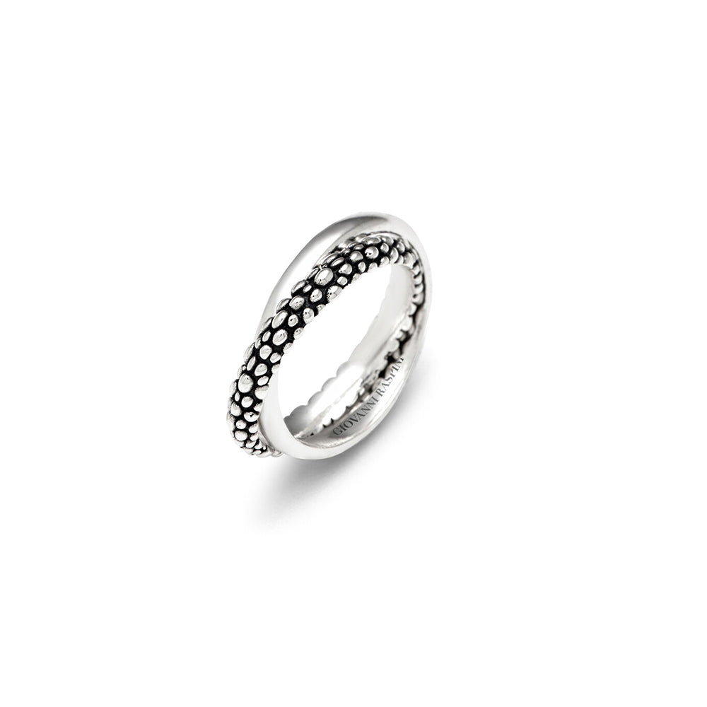 Un anello liscio e luminosissimo ne incontra un altro col decoro Perlage. Questo anello doppio in argento e argento brunito regala tutto il fascino dell'antica fusione a cera persa, coniugando minimalismo e artigianalità realizzativa. Fatto completamente a mano in azienda