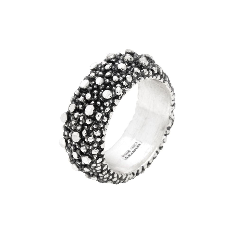 L'anello Petit Perlage è un capolavoro che celebra l’arte della fusione a cera persa. La sua raffinata lavorazione artigianale si distingue per il pavé di delicate sferette in argento brunito, finemente diamantate, che donano un gioco di luce unico e sofisticato. Realizzato a mano in azienda.
