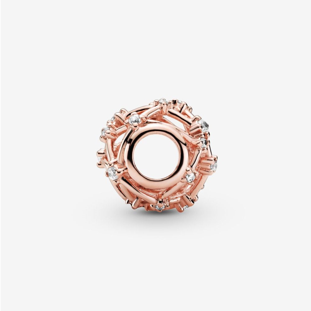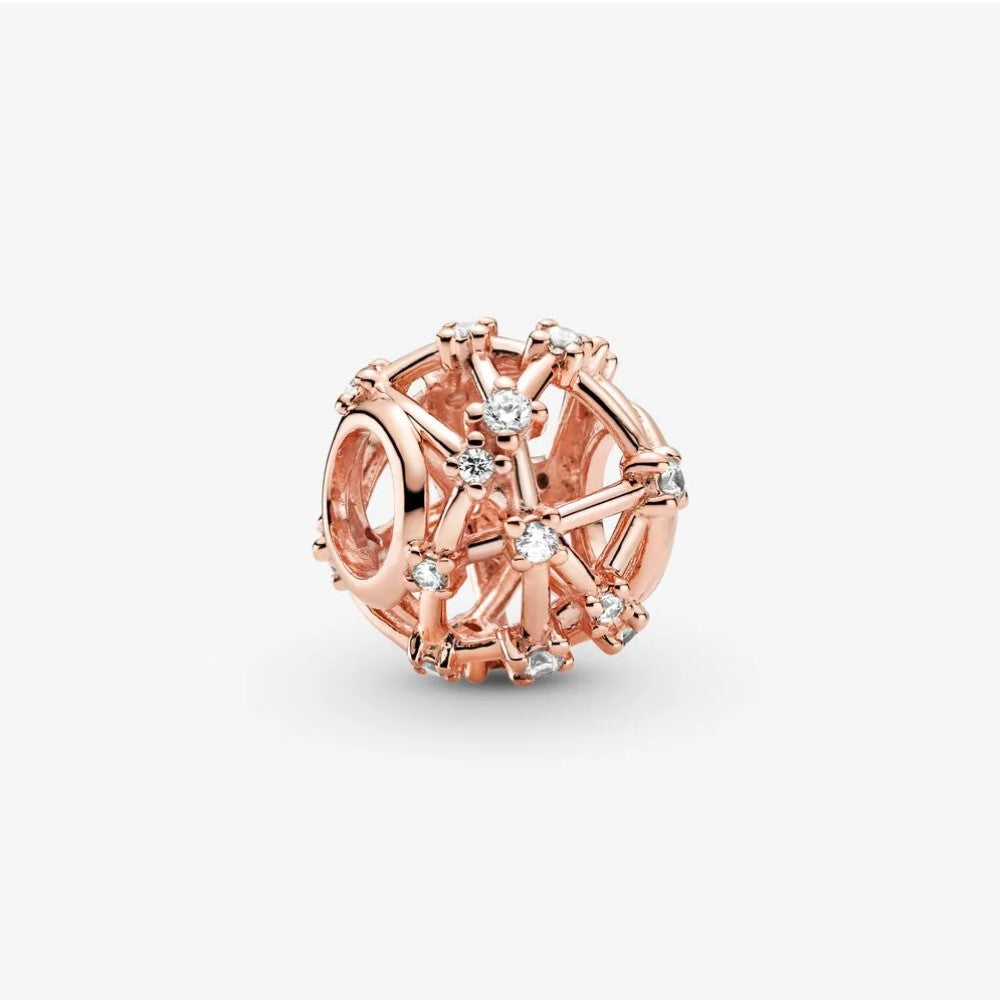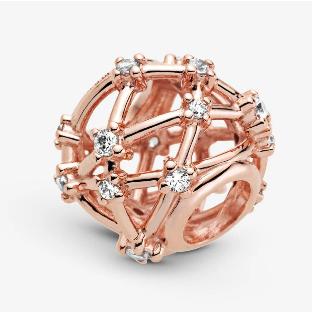Cerca le risposte nelle notti stellate con questo charm openwork Costellazioni. Rifinito a mano e realizzato in Pandora Rose (la nostra esclusiva lega metallica con placcatura in Oro rosa 14K), il charm si ispira a un gioiello dedicato alla galassia conservato negli archivi Pandora. Le pietre incolori sono incastonate lungo le linee arrotondate con lavorazione openwork del charm per rappresentare le costellazioni nello spazio. Indossalo insieme ad altri charm a tema celestiale sul tuo bracciale Pandora Moments preferito per dimostrare il tuo amore per l’universo.