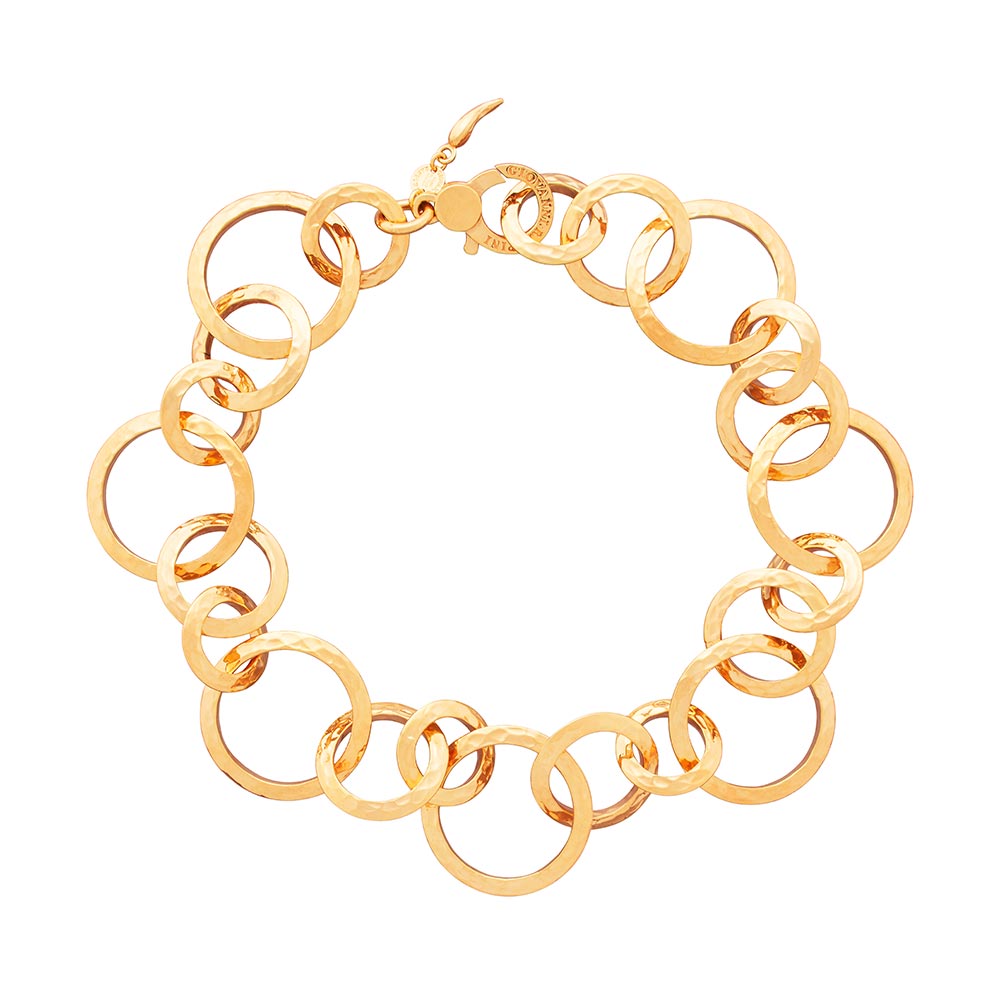 Una collana bellissima, materica, con texture che regalano una straordinaria lucentezza: anelli in tre dimensioni, realizzati con lastra d'argento martellata a mano e quindi dorata. Una collana che interpreta l'amore di Giovanni Raspini per il design contemporaneo.