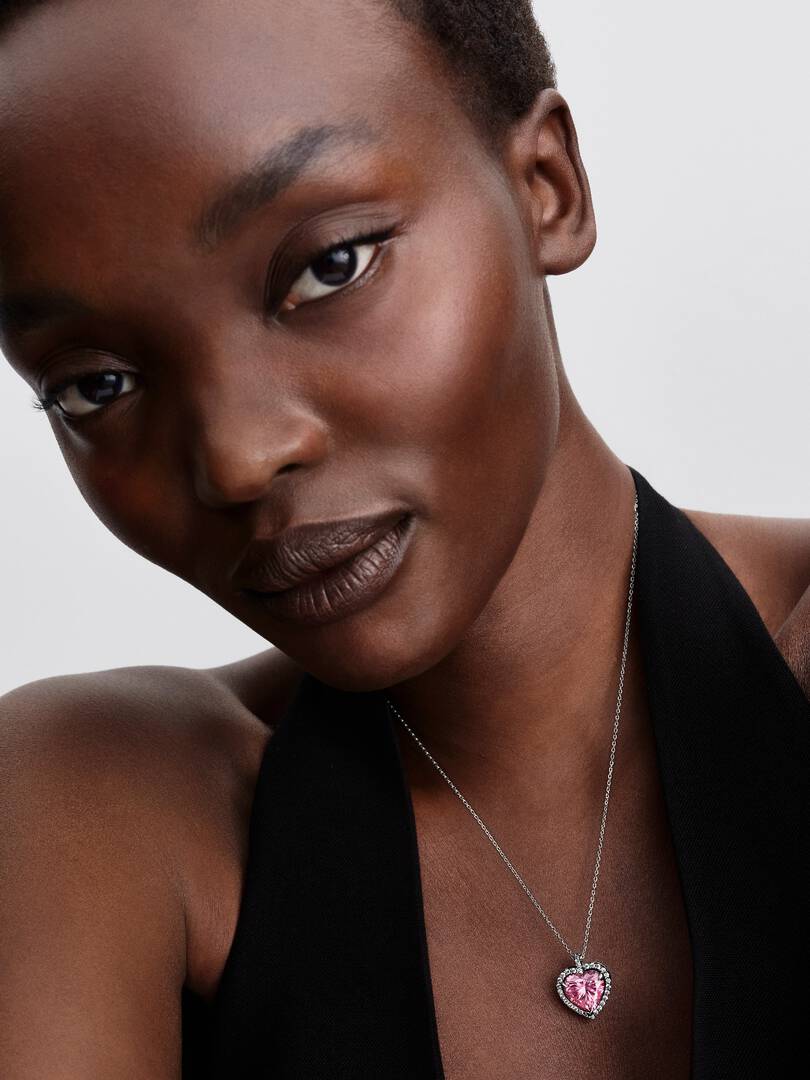 Affidati all'amore. Questa collana in Argento Sterling 925 presenta una pietra di zirconia cubica rosa a forma di cuore, incorniciata da uno luminoso profilo di pietre incolori. Il pendente si muove liberamente lungo la