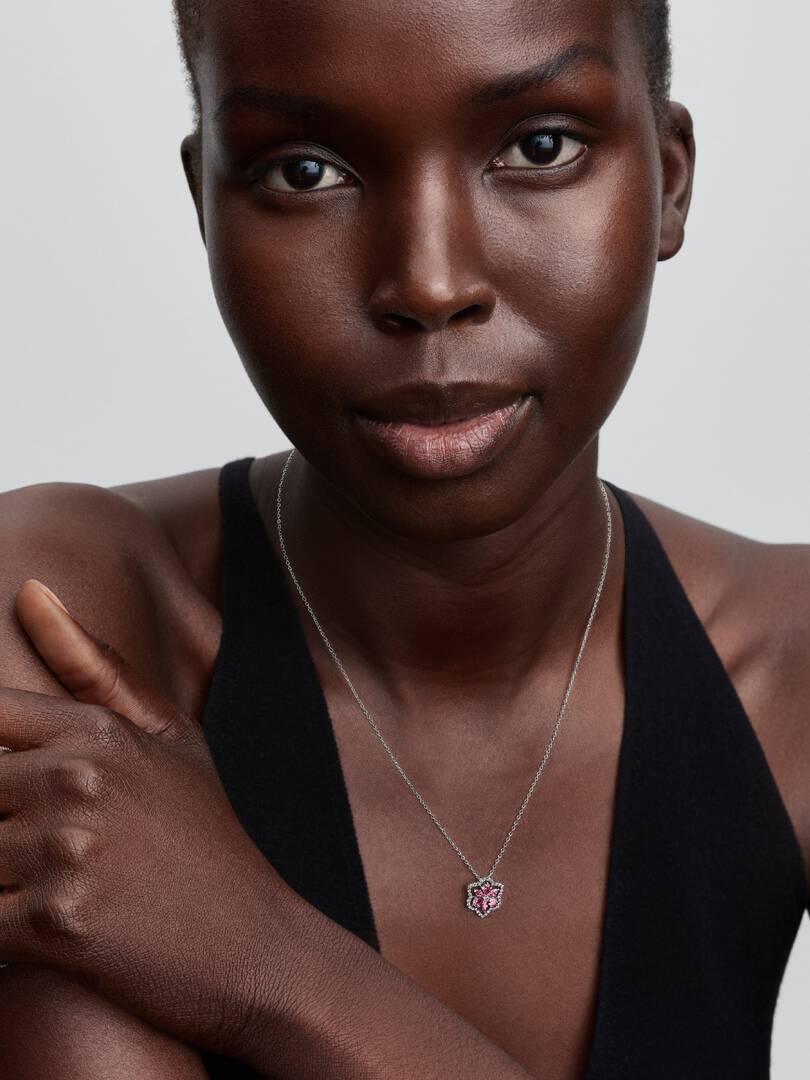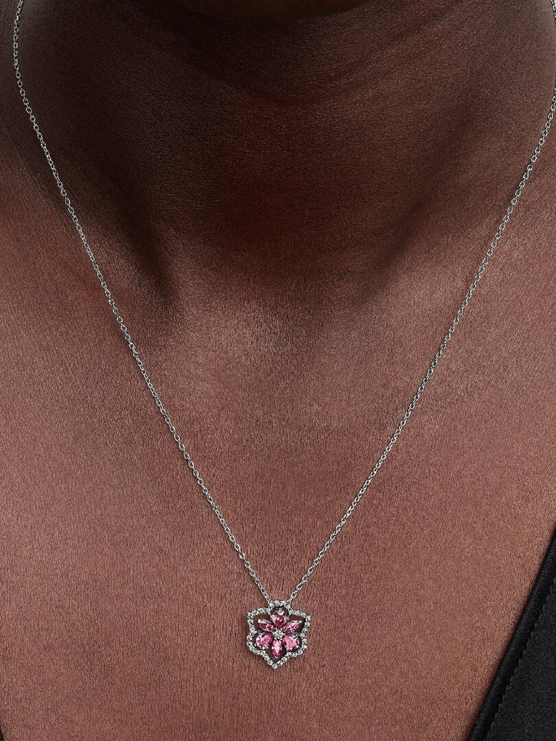 Porta con te la bellezza della natura con questa collana Herbarium Fiore Rosa. La nuova collana in Argento Sterling 925 presenta una composizione di pietre rosa e incolori che formano un motivo floreale. Il pendente si muove liberamente lungo la catena per catturare la luce da ogni angolazione.
