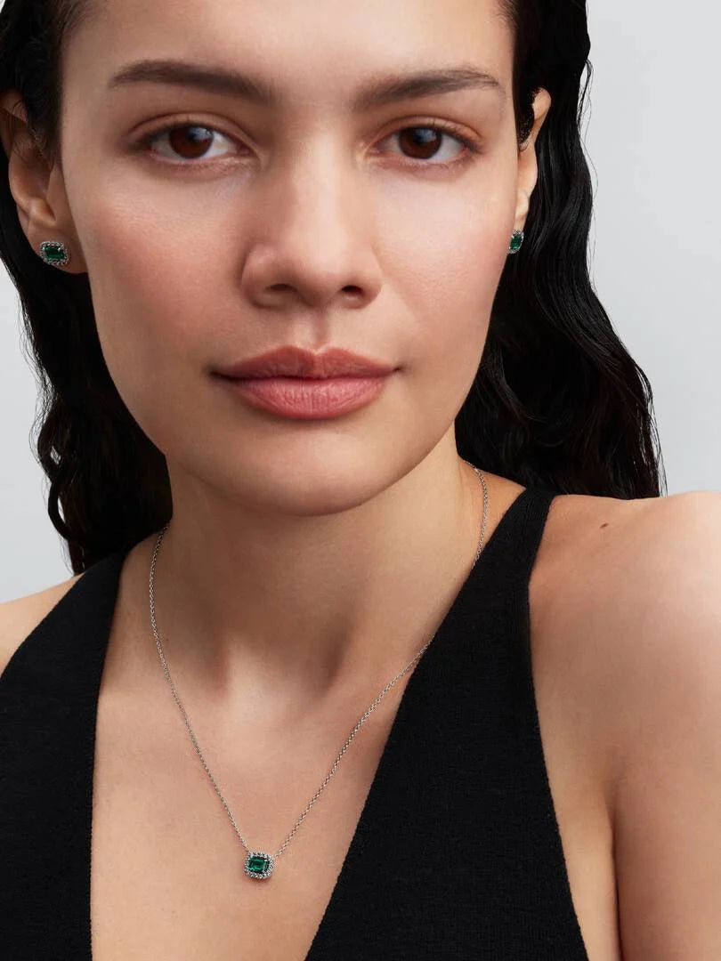 Immergiti nell’incanto del verde smeraldo. Decorata da una pietra centrale verde circondata da pavé su una catena in Argento Sterling 925, questa collana scenografica si ispira ai tesori nascosti nei portagioie di un tempo.
