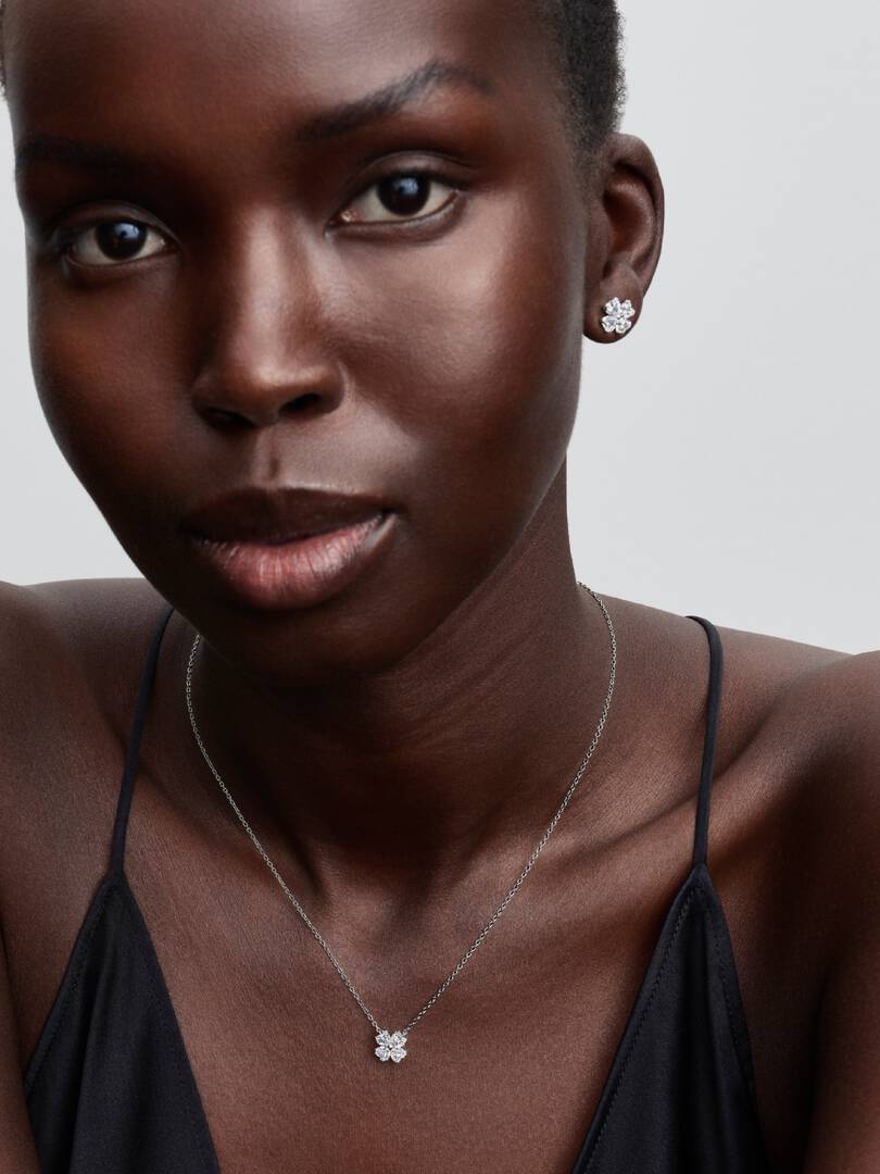 Ti senti fortunata? Questa collana con pendente a forma di quadrifoglio, realizzata in Argento Sterling 925 con scintillanti pietre a cuore, aggiunge un tocco naturale a qualsiasi look.