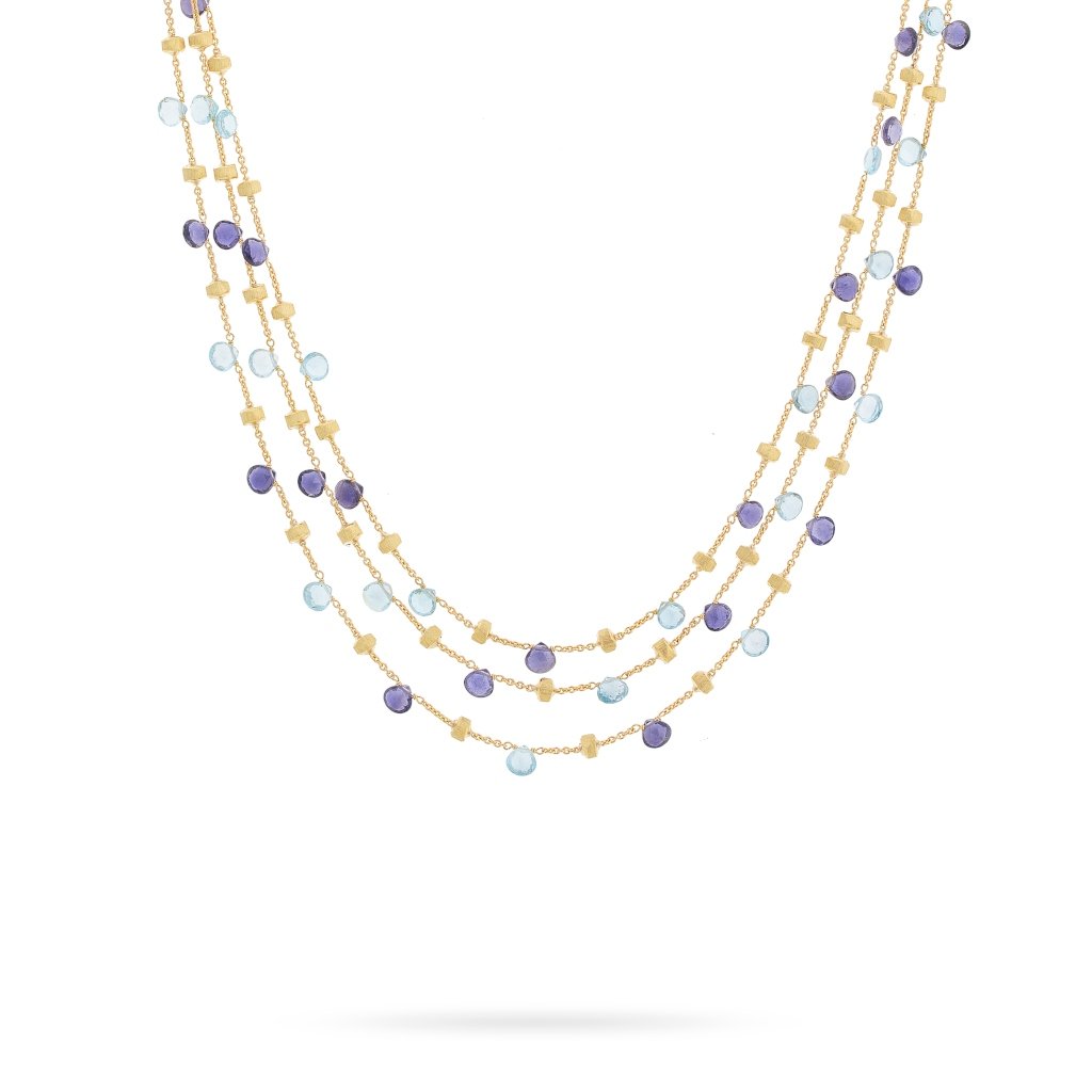 Collana in oro giallo 18 carati collana corta a tre fili con iolite a taglio tabeez e topazio blu. Un classico senza tempo e giocoso di Marco Bicego, questa collana Paradise Gemor Multicolor è incisa a mano da artigiani italiani e composta da pietre raccolte a mano.