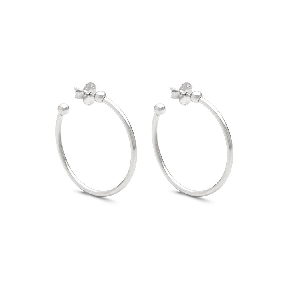 Dal design moderno e senza tempo, questi orecchini in argento celebrano la purezza del cerchio e la raffinatezza dei dettagli artigianali. Le due sferette alle estremità creano un gioco di equilibrio ed eleganza. Interamente fatti a mano in azienda.