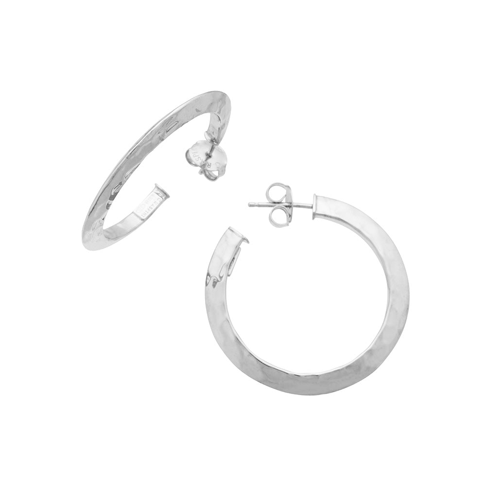 Questi orecchini a cerchio, dalla sezione triangolare e con una texture che riflette una luce intensa, sono parte della collezione Blade. Ogni gioiello è progettato per un look deciso e rock, realizzato in azienda con una lastra d'argento martellata a mano.