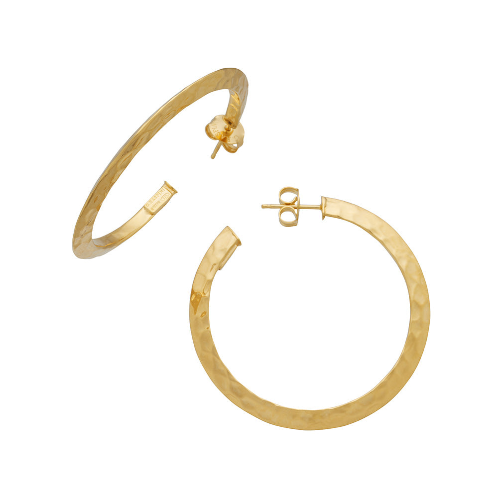Grandi orecchini a cerchio in argento dorato con una texture che regala una straordinaria lucentezza. Realizzati in azienda con lastra d'argento martellata a mano e successivamente dorati.