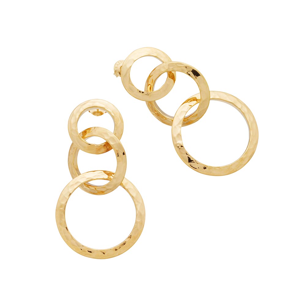 Questi meravigliosi orecchini a cascata in argento dorato, con anelli in tre dimensioni, mostrano una texture materica che regala una straordinaria lucentezza. Realizzati con lastra d'argento martellata a mano, raccontano la passione di Giovanni Raspini per il design contemporaneo e per la ricerca di nuove forme.