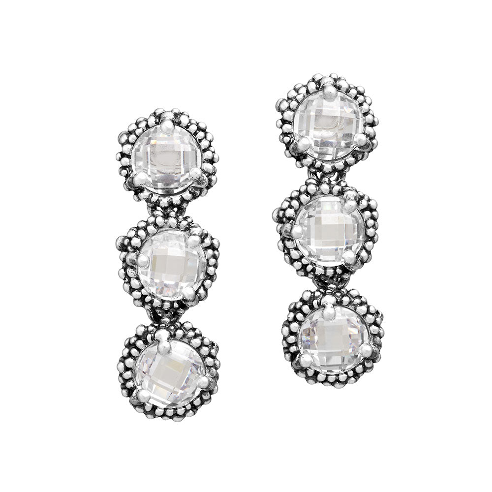 Una cascata di luce e bellezza caratterizza gli orecchini Shine, che nascono dal connubio fra la purezza degli zirconi trasparenti e l'eleganza contemporanea del decoro stile Perlage, in argento brunito, fuso a cera persa. Fatti completamente a mano in azienda.
