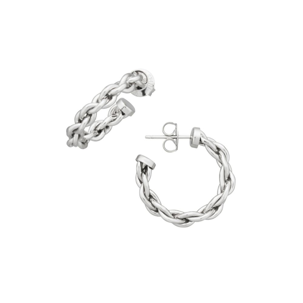 Giovanni Raspini propone questi piccoli ed eleganti orecchini a cerchio in argento fuso a cera persa. La forma di questi orecchini si ispira ad una catena classica, ma con effetto rigido. Fatti a mano in azienda. Per una donna che ama la bellezza dell'unicità.