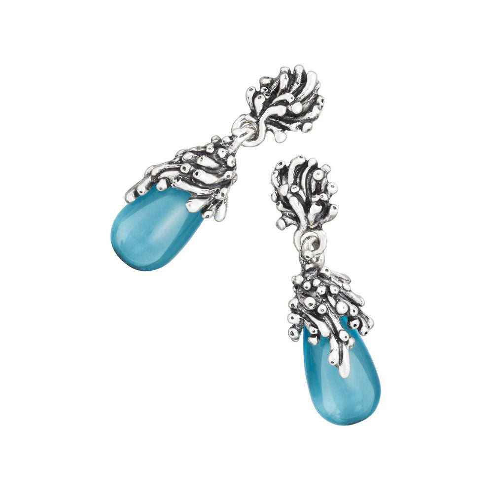 Gli orecchini Goccia Mare sono un omaggio alla delicatezza del mondo marino. La lavorazione con fusione a cera persa in argento riproduce con eleganza la forma di un anemone, che avvolge un cristallo azzurro dalla forma a goccia. Realizzati a mano in azienda.