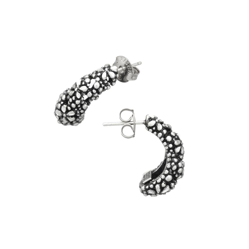 Una vera dichiarazione di stile. Ispirati ai volumi della sfera, questi orecchini sono abbelliti da mille sferette lucidissime, regalando un indosso leggero e prezioso. Essi uniscono l'eleganza contemporanea alla grande tradizione della fusione a cera persa in argento. Vengono realizzati in azienda completamente a mano.