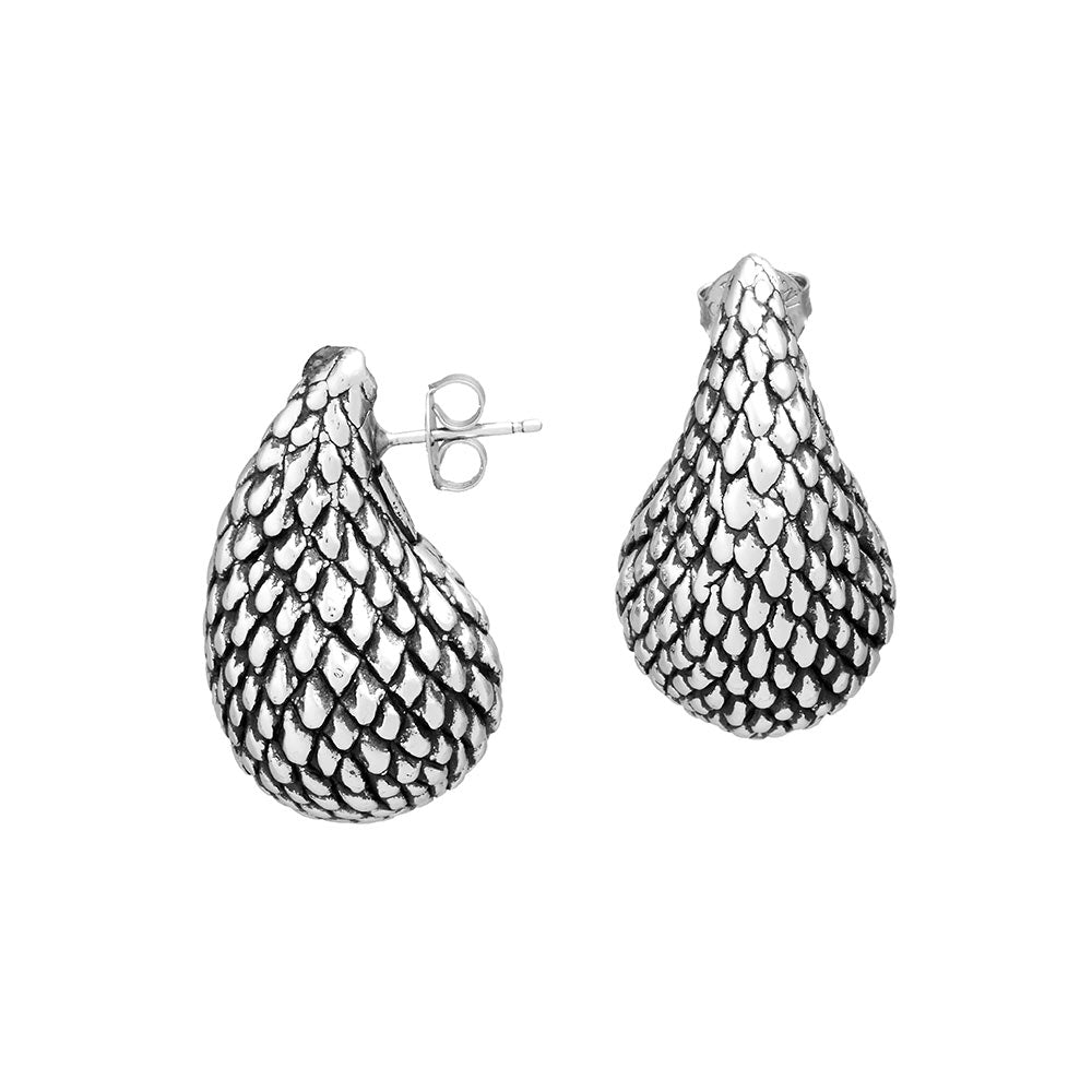 Questi particolari orecchini sviluppano il tema stilistico della goccia d'acqua. Realizzati in argento, vuoti all'interno e quindi leggerissimi, evidenziano un'elegante texture di serpente che regala al volto grande luminosità.