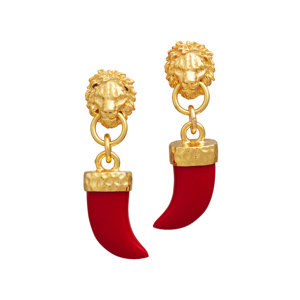Le teste di leone, fuse a cera persa nell'argento e quindi dorate, sostengono due iconiche zanne in resina ecologica. I nostri orecchini, realizzati interamente a mano in azienda, regalano luce, colore e gioia.