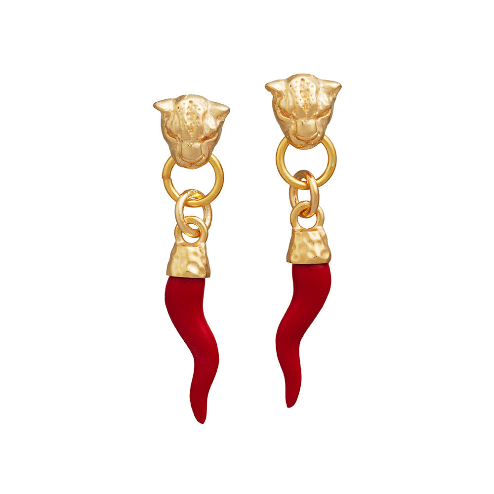 Questi nostri orecchini regalano luce, colore ed eleganza animalier. Due teste di leopardo, fuse in argento a cera persa e quindi dorate, sostengono ognuna un cornino rosso in resina ecologica. Realizzati competamente a mano in azienda.