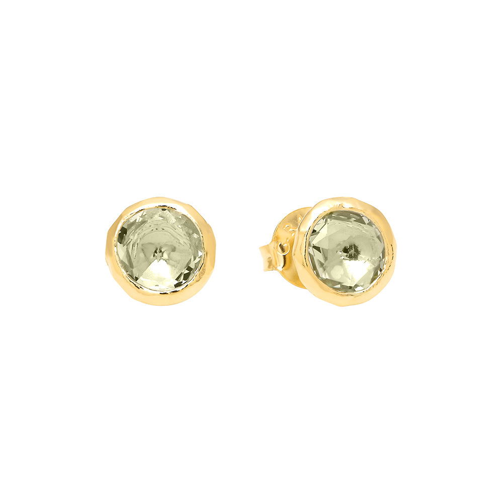 Bellissimi nella loro semplicità, in argento dorato, questi orecchini a bottone montano due cristalli verde lime con taglio rotondo incastonati "a giorno" da una fascetta elegante e minimal. Realizzati a mano in azienda.