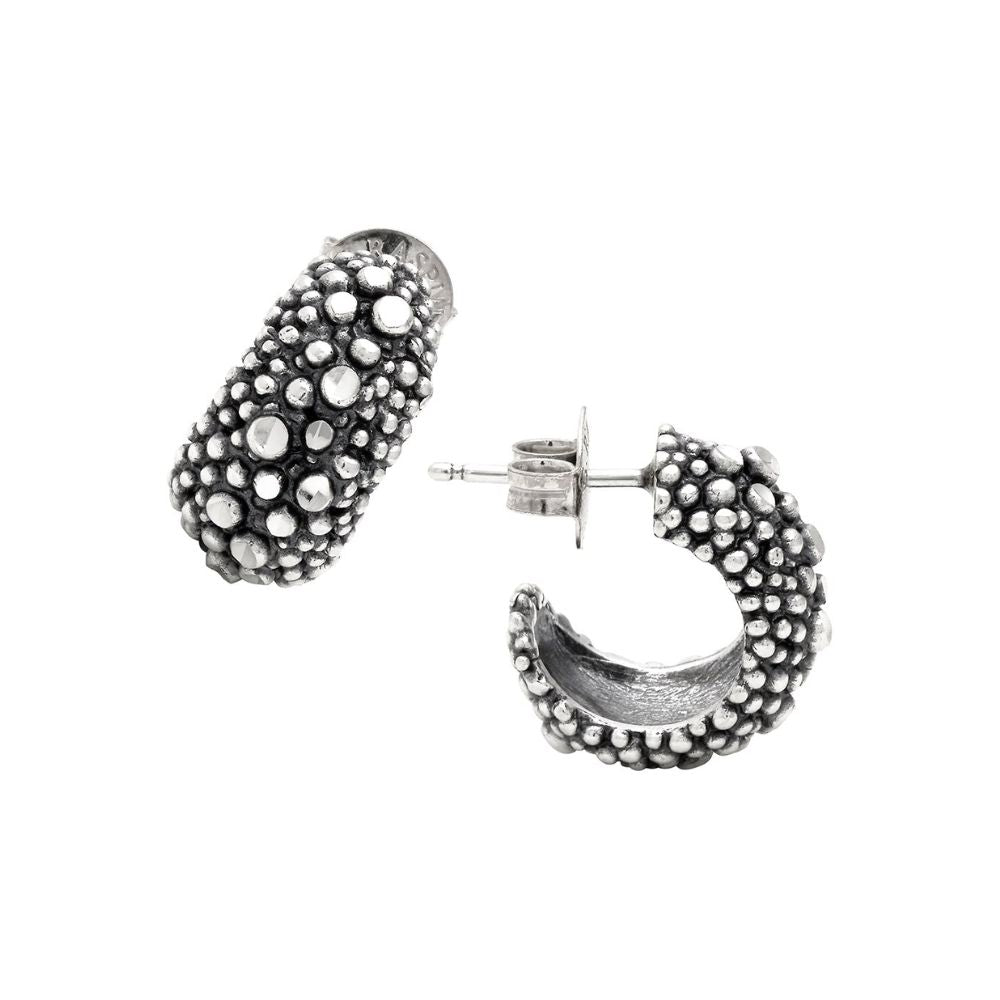 Raffinati e luminosi, gli orecchini Petit Perlage uniscono sapienza artigianale e design contemporaneo. Realizzati con la tecnica della fusione a cera persa, presentano una superficie in argento brunito, animata da un pavé di microsfere finemente diamantate. Realizzati a mano in azienda.