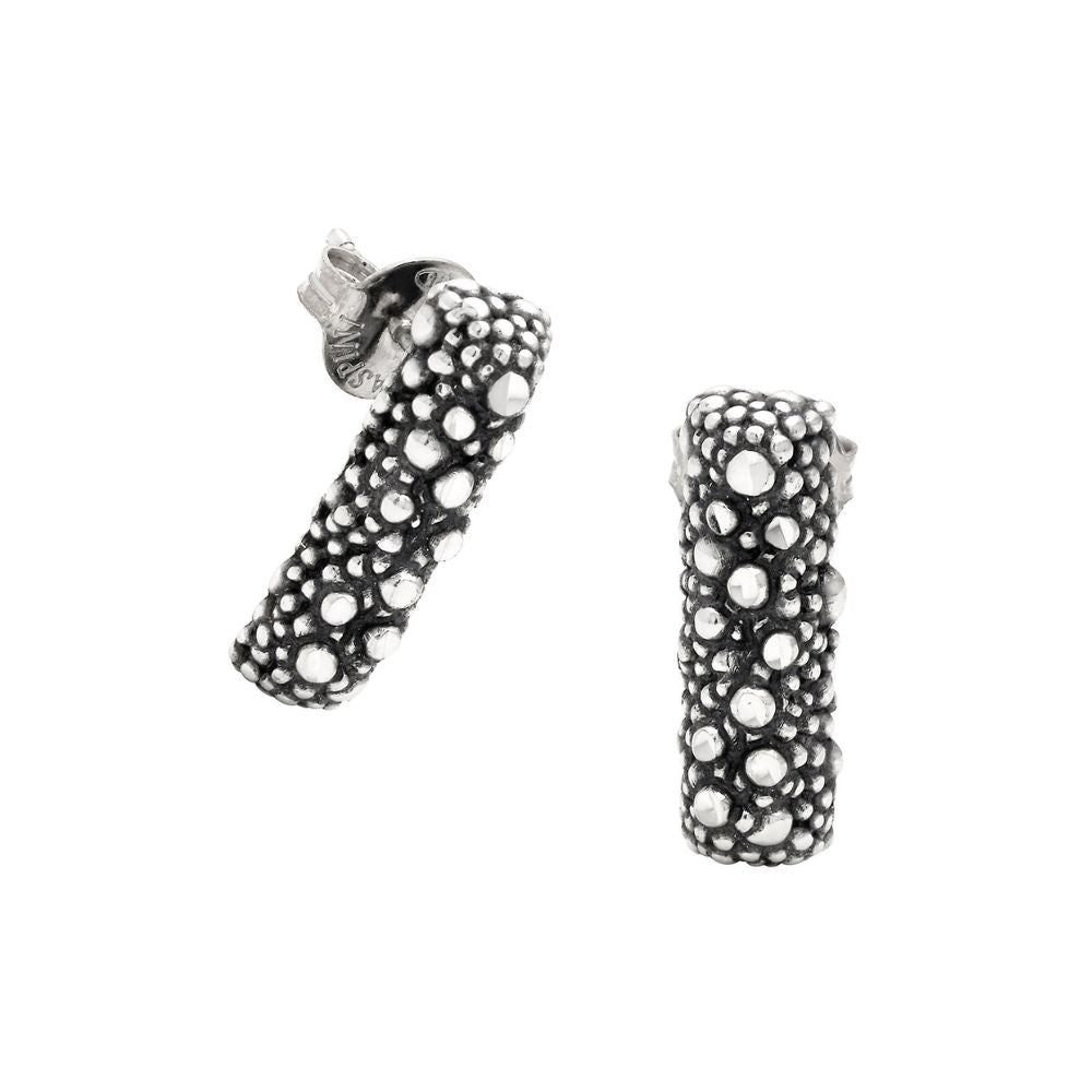 Raffinati e dal gusto senza tempo, gli orecchini Petit Perlage Piccoli celebrano l’arte orafa tradizionale attraverso la tecnica della fusione a cera persa. La superficie è impreziosita da un pavé di micro sferette in argento brunito, esaltato da una diamantatura che cattura e riflette la luce. Realizzati a mano in azienda.