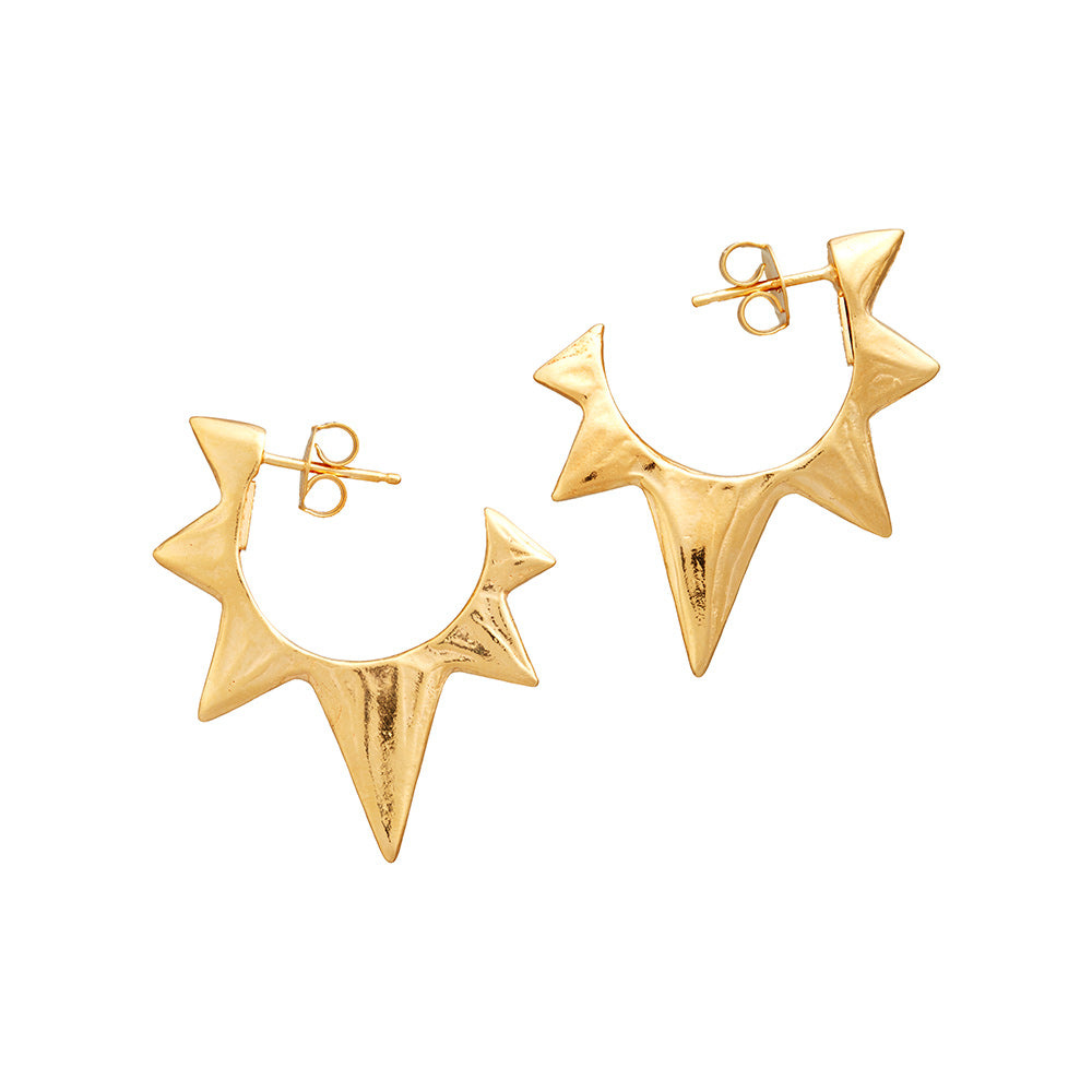 Gli orecchini Rock Star in argento dorato propongono una superficie spatolata a mano e bordi in forma di cuspidi. Modernissimi e particolari, vengono realizzati interamente a mano con l'antica tecnica della fusione a cera persa.