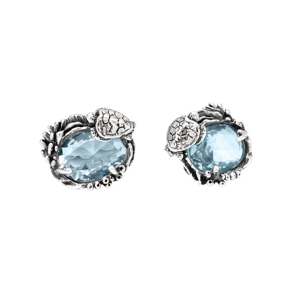 Realizzati completamente a mano, in argento brunito, questi orecchini testimoniano tutto l'amore di Giovanni Raspini per il mondo marino, mettendo insieme tradizione e bellezza. L'argento, fuso a cera persa, incontra la delicatezza coloristica del quarzo color azzurro acquamarina. Fatti completamente a mano.
