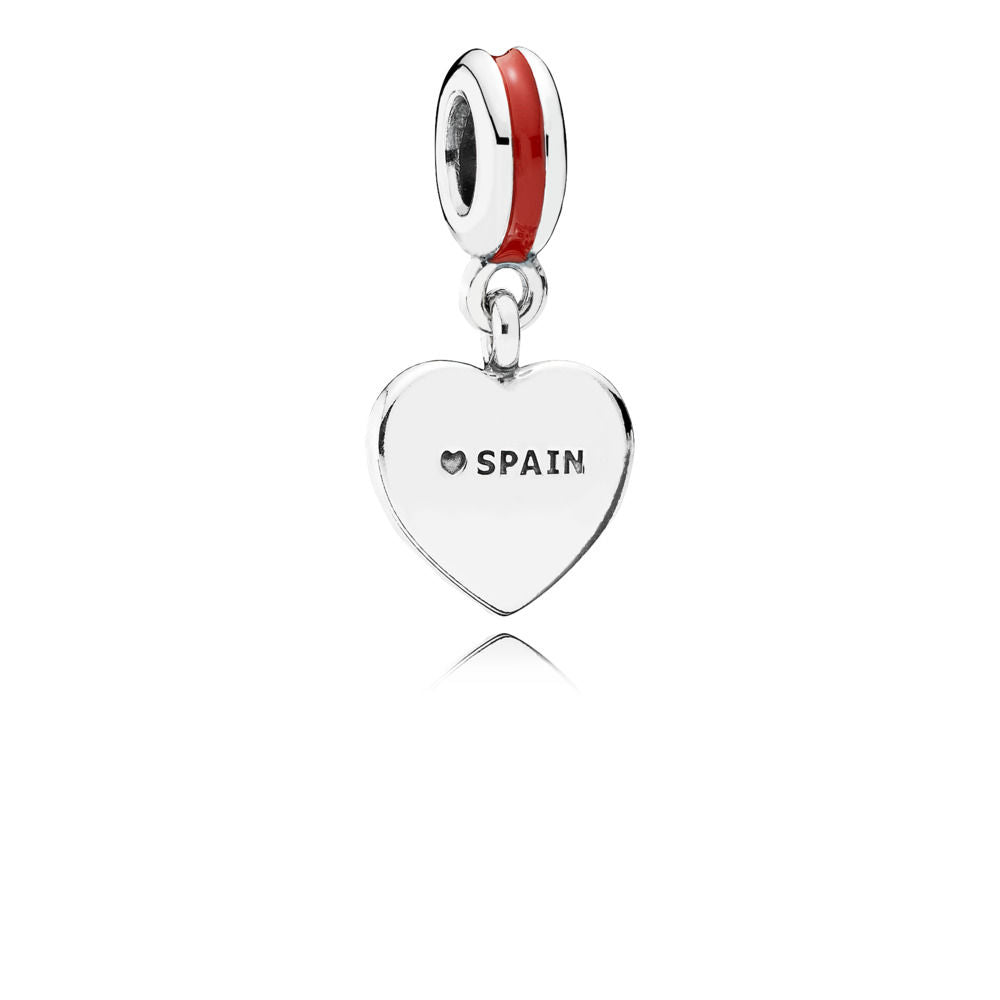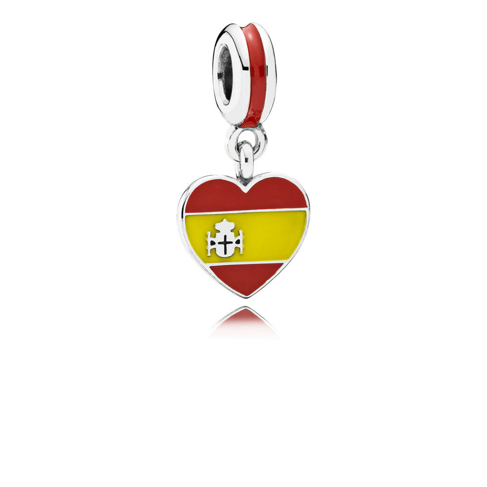 Questo charm pendente PANDORA a forma di cuore raffigura la bandiera spagnola, in argento Sterling con all’interno smalto rosso e giallo.