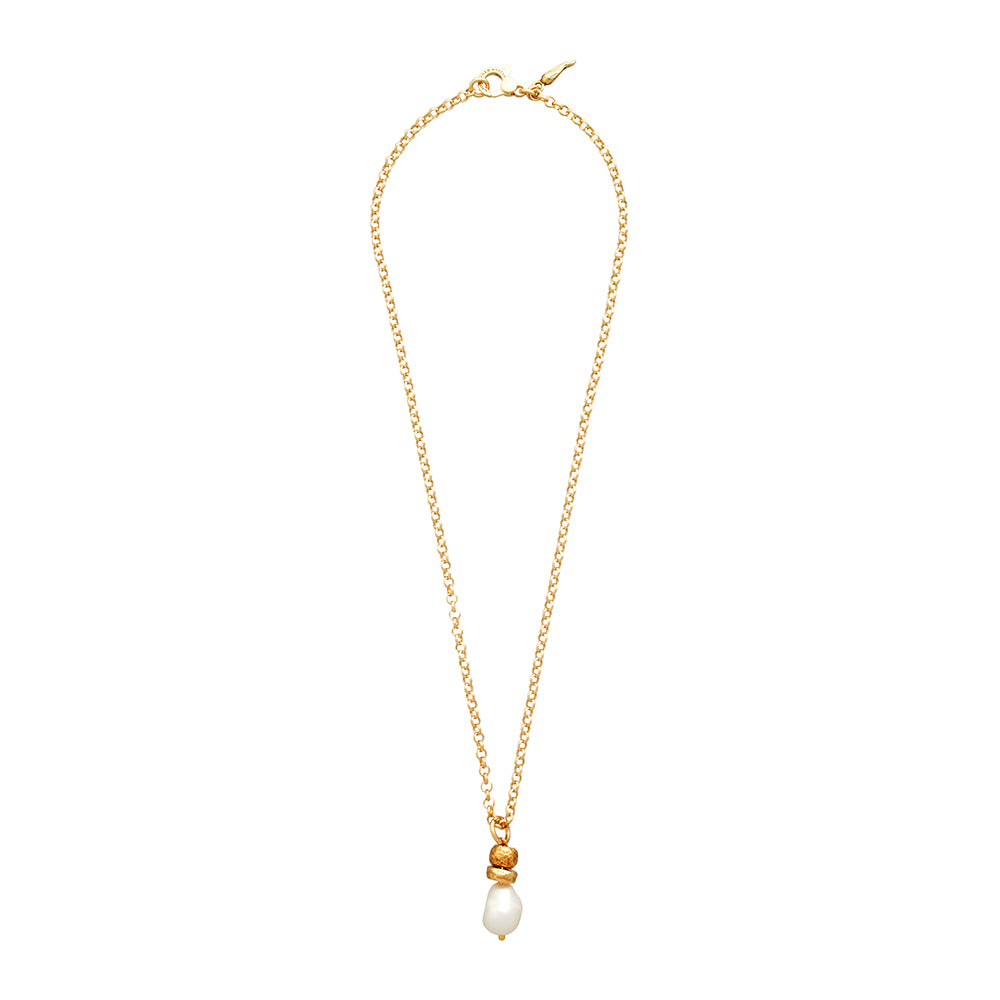 Una grande perla barocca d'acqua dolce dà vita ad un pendente ricco di luce e materia preziosa. In abbinamento ad un decoro in argento dorato, la perla è agganciata ad una catena rolò di 45 centimetri, sempre in argento dorato. Realizzato completamente a mano in azienda.