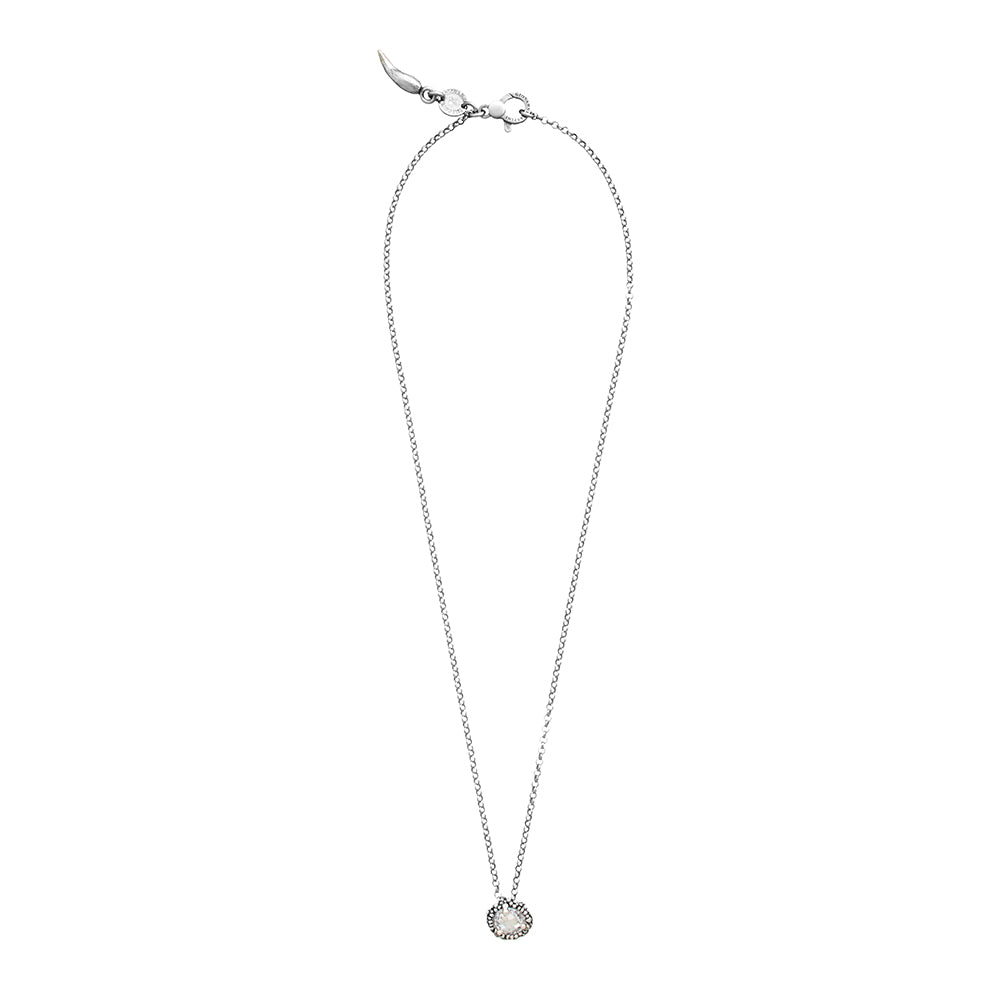 Un elegante pendente, con catena in argento di 45 centimetri, che nasce dal dialogo contemporaneo fra la luminosità purissima dello zircone trasparente e la bellezza del decoro stile Perlage in argento brunito. Realizzato in azienda.